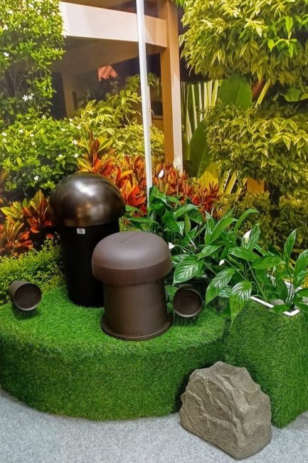 Эти «грибочки» на самом деле сабвуферы. А «камень» на полу — уличный динамик серии Rock.