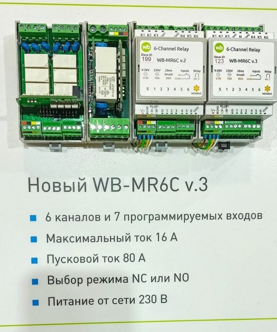 Выходит обновлённая версия модулей реле WB-MR6C v.3. Основные отличия в появлении контакта нейтрали, наличии встроенного источника питания (если питание от шины пропадёт, модуль продолжит работать),- возможности программно определить каждый выход на НО или НЗ при пропадании шины. В общем, повышается надёжность.
