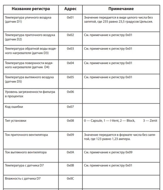 Есть регистры holding, из которых можно как считывать значение, так и записывать. Например, записываем в регистр 0х01 значение 0 — вентмашина отключится. А есть регистры input, с них мы можем только считывать данные.