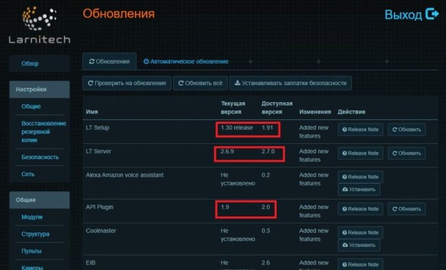 Далее заходим в Модули и смотрим, не предлагается ли обновить прошивку контроллера и подключенных модулей на релизной. Если доступно, то обновляем.