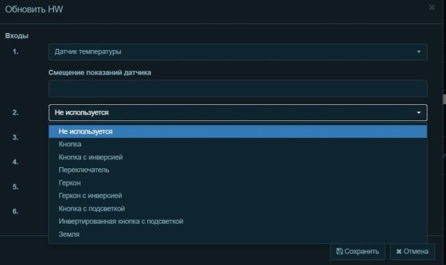 При настройке работы модуля BW-SW06.B мы задаём на вход 1 датчик температуры, а поле назначения входа 2 автоматически меняется на «Питание». Но вот с более новым модулем BW-SW06.C мы не можем выбрать «Питание», его нет в списке вообще.