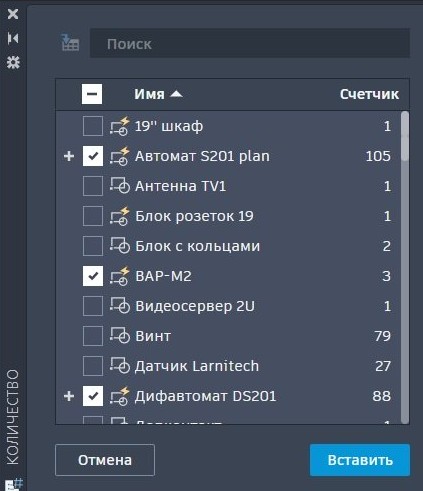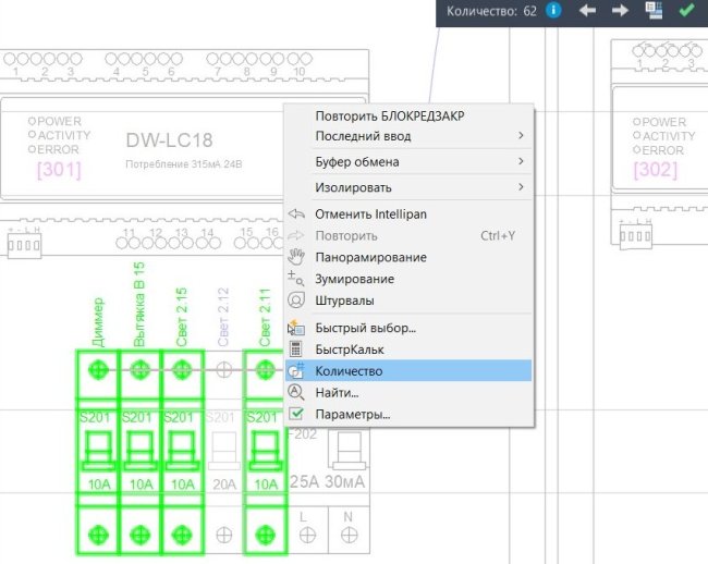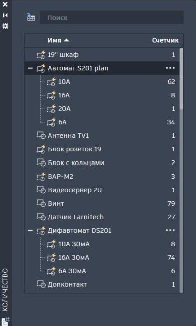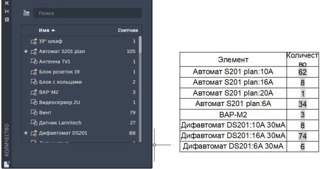 Если нам нужно просто быстро посчитать количество, чтобы вписать его в отдельную таблицу (как делаю я, мне удобнее все таблицы делать в Excel), то можно либо нажать на элемент правой кнопкой мыши и выбрать пункт меню «Количество», чтобы увидеть количество блоков с такими же аттрибутами, как и у выбранного. Появляется панелька (на скриншоте справа сверху) с количеством и стрелками для перемещения между подсчитанными блоками. Считаются только блока с такими же аттрибутами, как выделенный!