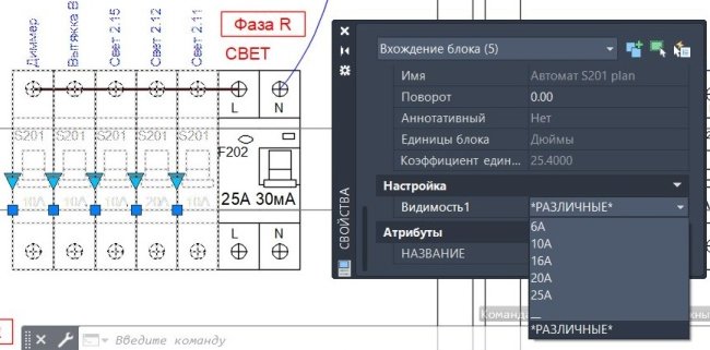 Автоматы и УЗО тоже легко делать динамическими. Здесь у него динамически меняется номинал (параметр видимости) и назначение (атрибут). Было бы здорово сделать ещё одну ручку параметра видимости для того, чтобы на автомате появилась буква его фазы, но AutoCAD не позволяет сделать два выбора в одном блоке.