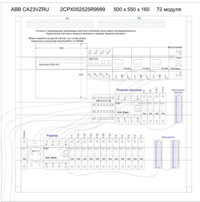 У нас было ограничение по ширине электрощитов 600мм, в один щит ABB CA28 высотой 1250мм мы немного не помещались, так что пришлось брать два электрощита: ABB CA23VZRU (высота 500мм) и ABB CA26VZRU (высота 950мм) и располагать их один над другим.