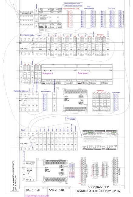 Расскажу о проекте квартиры площадью 125 квадратных метров, в которой система Умный Дом выполнена на контроллере EasyHomePLC (разрабатывается изготавливается в Санкт-Петербурге) Возможности системы Спроектированная система Умный Дом умеет следующие вещи: Управление 28 группами освещения, в том числе четырьмя с возможностью диммирования Управление 8 светодиодными лентами, в том числе шестью с возможностью диммирования Управление пятью розетками в квартире с контроллера EasyHomePLC, отдельное управление каждой розеткой Управление тремя вытяжками санузлов по заданным алгоритмам (без датчиков влажности в санузлах) Управление шестью тёплыми полами с контролем температуры каждого пола Считывание импульсов с четырёх счётчиков водоснабжения Снятие сигнала тревоги с двух автономных систем контроля протечки воды Neptun Управление приточно-вытяжной вентустановкой Comfovent по RS485 Управление двумя электрокарнизами Датчики движения для управления освещением в 5 местах (санузлы, постирочная, прихожая, коридор) Управление пятью группами радиаторов водяного отопления 5 датчиков температуры и влажности воздуха в комнатах Также проект включает электроснабжение, охранно-пожарную сигнализацию Ajax, компьютерную сеть из роутера Asus, дополнительной точки доступа Wi-Fi и 8-портового коммутатора, домофонию Визит. Технические решения Отдельный слаботочный шкаф формата 19″ не предполагается, а на полку в шкафу в прихожей ставятся ИБП с розетками, роутер, коммутатор и панель сигнализации Ajax. У нас было ограничение по ширине электрощитов 600мм, в один щит ABB CA28 высотой 1250мм мы немного не помещались, так что пришлось брать два электрощита: ABB CA23VZRU (высота 500мм) и ABB CA26VZRU (высота 950мм) и располагать их один над другим. В верхнем щите счётчик, реле напряжения, неуправляемые розетки и питание вентмашины, а в нижнем всё то, что управляется с Умного Дома. Вот отдельная схема питания элементов Умного Дома, я такую всегда рисую для любой системы: От резервируемого аккумуляторами блока питания Meanwell DRC-60B питается только контроллер EasyHomePLC и его блоки реле, а модули дискретного ввода и вывода Овен и диммер EasyHomeDIM питаются от 230 вольт. Всё очень хорошо распределилось по вводам и выводам, осталось немного резерва для подключения ещё чего-нибудь. У EasyHomePLC довольно мудрёное подключение диммируемых светодиодных лент к ШИМ выходам (хотя, оно везде сложное), поэтому нарисовал на эту тему отдельную схему: Важно помнить, что у модулей дискретного вывода Овен МУ110-32Р, как и модулей на другое количество реле, встроенные реле очень слабые. По инструкции они на 3 ампера, а на практике они залипают (то есть, включаются и уже не выключаются) от любой нагрузки хоть с каким-то пусковым током. Поэтому всё, что подключается к реле модуля Овен и питается от 230 вольт, идёт через отдельные реле с катушкой 24 вольта. Без реле подключаются только приводы радиаторов (они хоть и на 230 вольт, но у них ток не более 0.5 ампера и нет пускового тока) и 24-вольтовые светодиодные ленты. Электрошторы точно всегда надо подключать к Овену через реле. Стоимость оборудования Вот расчёт оборудования Умного Дома: Преобразователь интерфейсов RS485-USB здесь для того, чтобы настроить скорость работы и адреса в модулях Овен, больше он ни для чего не нужен. Датчики температуры воздуха (которых 6 штук) служат преобразователями для сенсоров те