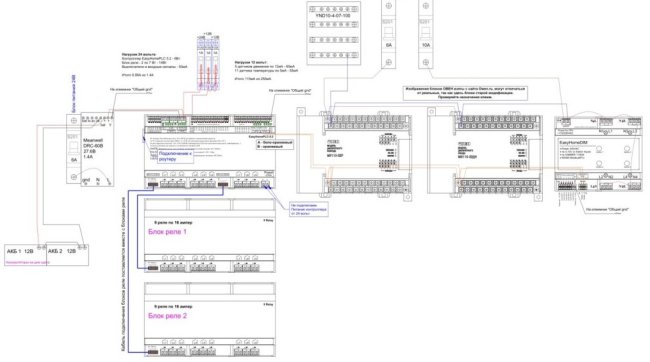 Важно помнить, что у модулей дискретного вывода Овен МУ110-32Р, как и модулей на другое количество реле, встроенные реле очень слабые. По инструкции они на 3 ампера, а на практике они залипают (то есть, включаются и уже не выключаются) от любой нагрузки хоть с каким-то пусковым током. Поэтому всё, что подключается к реле модуля Овен и питается от 230 вольт, идёт через отдельные реле с катушкой 24 вольта. Без реле подключаются только приводы радиаторов (они хоть и на 230 вольт, но у них ток не более 0.5 ампера и нет пускового тока) и 24-вольтовые светодиодные ленты. Электрошторы точно всегда надо подключать к Овену через реле.