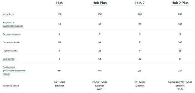 Вот таблица сравнения хабов (центральных модулей) Ajax, по ней видно количество подключаемых элементов.