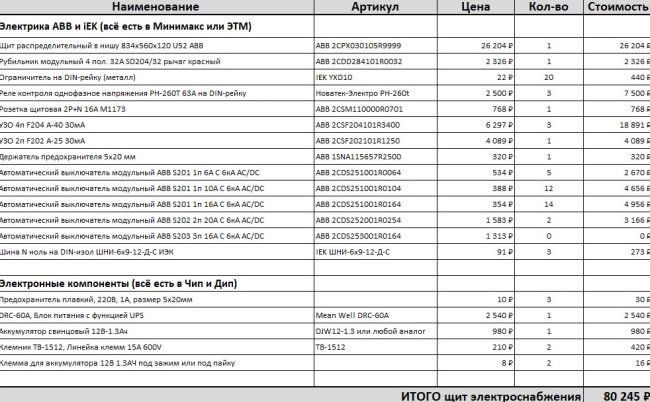 Стоимость электрощита, оборудования ABB (автоматы, УЗО), реле напряжения и всего сопутствующего — 80 тысяч.