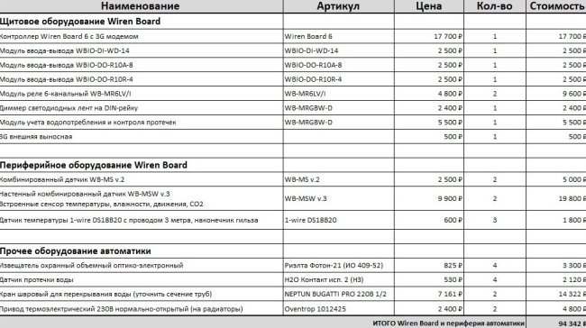 Стоимость оборудования Wirenboard, а также сопутствующего оборудования автоматики (датчики протечки, краны, приводы радиаторов) — 94 тысячи.