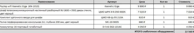 Стоимость слаботочного оборудования (шкаф, роутер, свитч) — 22500.