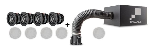 Есть, кстати, встраиваемые в потолок сабвуферы, при желании вместо 4-х динамиков большого размера в потолок можно поставить 4 небольших динамика (сателлита) и сабвуфер. Например, Sonance BPS6 Subwoofer и 4 динамика Sonance VP38R.