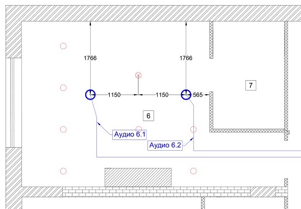 При прокладке акустических кабелей, как и всех слаботочных, соблюдаем требования к монтажу — расстояние не менее 100мм от силовых кабелей, при опуске с потолка до розетки допустимо не менее 50мм. Пересечение с силовыми под прямым углом допускается.