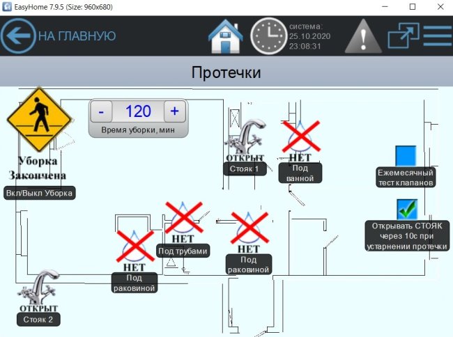 У EasyHomePLC или Beckhoff не нужны какие-либо дополнительные модули, датчики подключаются к дискретным входам, а краны с релейным выходам. В интерфейсе EasyHome мы сможем увидеть сработавший датчик, открыть воду, включить режим уборки на заданное время.