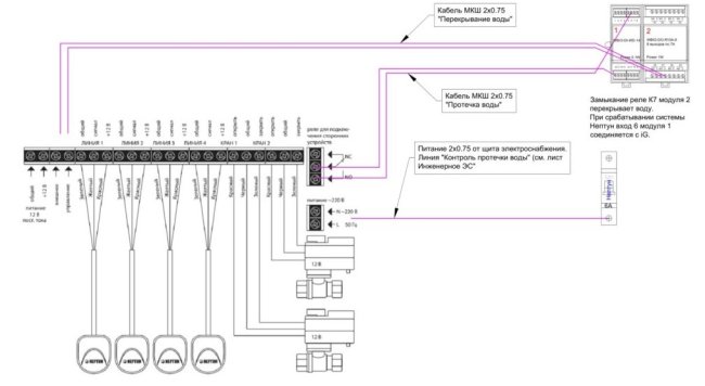 До кранов перекрывания воды монтируем кабель МКШ 5х0.75 или аналогичный. 5 жил хватит для любой модели крана. В квартире можно один кабель на оба крана параллельно, если оба крана перекрываются только одновременно.