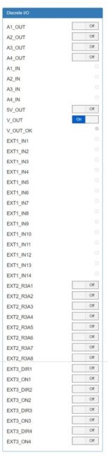 Видим температуру процессора и платы контроллера, напряжение питания, IP адреса разных интерфейсов, встроенные в контроллер выходы. A1, A2, A3, A4 — это четыре клеммы на на контроллере, они могут быть выходами (дискретными) или входами (дискретными или аналоговыми).