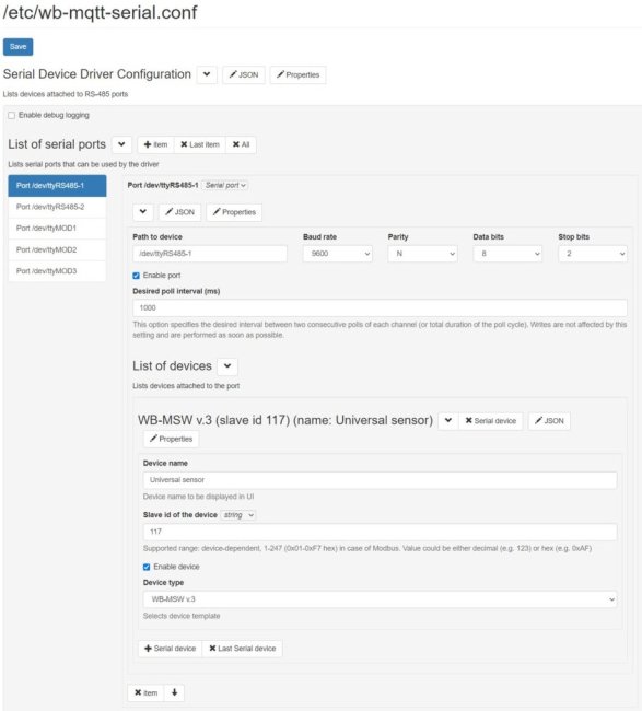 Выбираем порт RS485-1, на который я подключил модули, нажимаем кнопку + Serial Device, выбираем в выпадающем списке модель датчика, вводим его номер 117. Устройство добавлено.