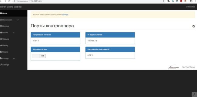 Таким образом, мы можем все элементы управления и индикаторы распределять максимально удобно. В пункте меню Settings можно выбрать, какой дашборд будет на вкладке Home, которая отображается при входе в web интерфейс контроллера.