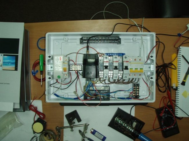 В 2012-2014 годах я занимался сборкой небольших электрощитов с GSM контроллером, которые могли управлять каким-то оборудованием через смс и отправлять смс в случае разных тревожных ситуаций. Для небольших загородных домов, в основном. Включение отопления, контроль температуры, сообщения о сработке датчиков дыма, газа, движения. Достаточно недорого. Вот один из таких щитков в процессе сборки: