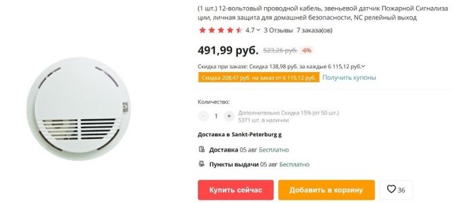 Вот датчик дыма Артон ИПД-3.2М НЗ, стоит 500-600 рублей.