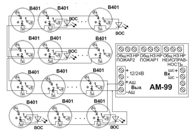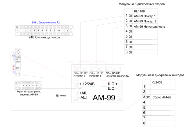 Питание модуля (и всех датчиков) 12 вольт. На модуле релейные выходы ПОЖАР1 (сработал 1 и более датчик), ПОЖАР2 (сработало 2 и более датчиков) НЕИСПРАВНОСТЬ (отключение питания модуля AM-99, замыкание в шлейфе или отсутствие датчика)