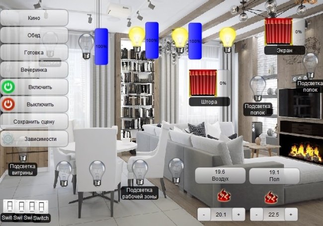 Мы можем придумать несколько сцен света в соответствии с возможными вариантами использования помещения: готовка, обед, кино, вечеринка. Каждой сцене мы прописываем состояние каждой имеющейся в помещении группе света: что включено, что выключено, что горит на какую яркость.