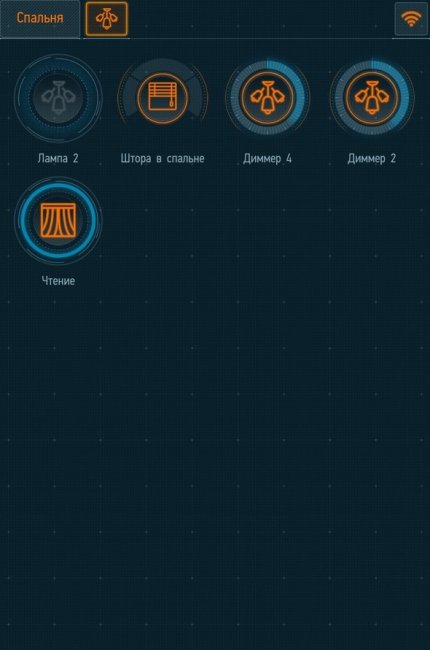 На экране элементы управления светом (синяя шкала рядом с иконкой лампочки — ползунок диммирования), шторами, температура. Слева 4 настраиваемых сцены, а также кнопки включения и выключения всего света, кнопка «Зависимости» для изменения соответствия света выключателям и кнопка «Сохранить сцену» для изменения сцены. Если сцены в помещении не используются, то эти кнопки можно убрать.