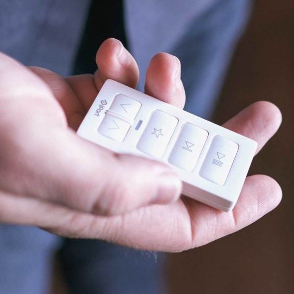 Панель можно крепить на магнитное крепление на стену либо положить в удобное место. Панель программируется на любой динамик или несколько динамиков. С неё можно делать тише-громче, останавливать и запускать музыку, включать любимый источник звука (кнопка со звёздочкой). Панель с собственным аккумулятором, заряжается через microUSB, время работы от зарядки зависит от частоты использования, в среднем, наверное, порядка месяца. Стоимость 169 долларов. Настраивается через собственное специальное приложение для iPhone, умеет сама обновлять прошивку.