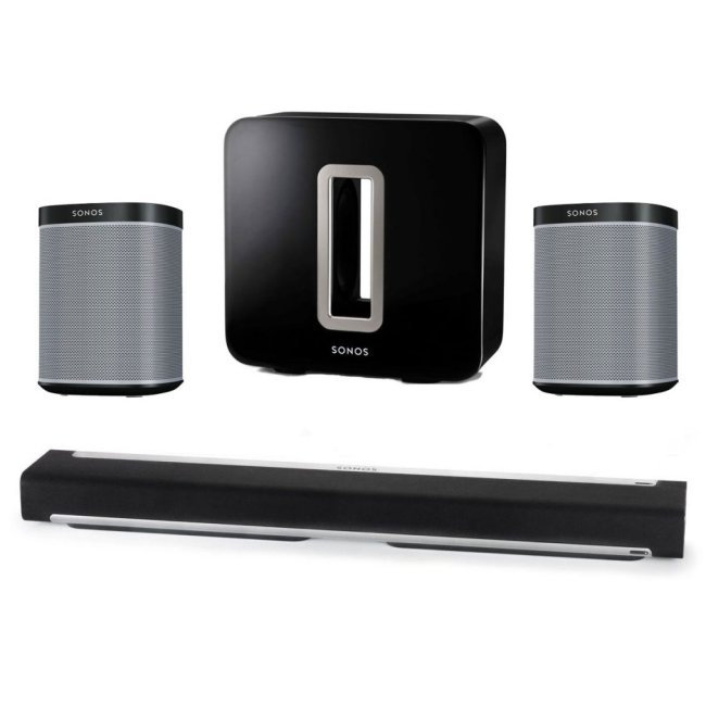 Комплект кинотеатра на Sonos состоит из любого саундбара, сабвуфера (можно без него), двух тыловых динамиков Play One или Play One SL. Саундбар подключается к телевизору либо ресиверу.