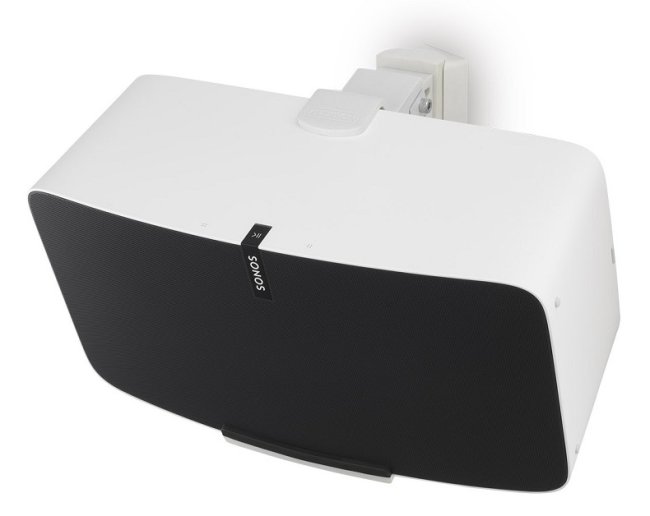 Sonos Play 5 гораздо крупнее, у неё более мощный звук. Для простоты можно представить, что она для помещения до 30, а то и 40 квадратных метров. Хотя, это условно, кому-то и двух Play 1 будет достаточно. A Play 5 будет играть гораздо лучше. Для неё тоже есть настенный кронштейн. Цвет решётки чёрный, боковой пластик может быть чёрным или белым.