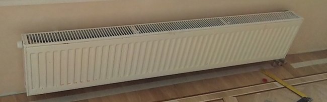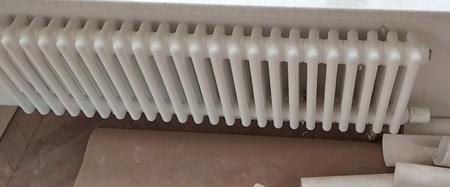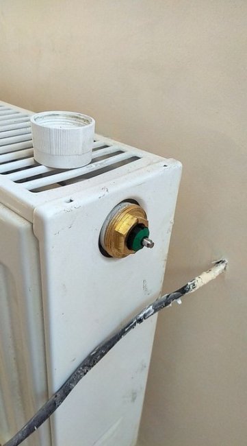А теперь, собственно, самая сложная вещь в установке приводов на радиатор. Она заключается в том, чтобы вывести кабель заранее именно в то место, где будет находиться привод, чтобы кабель от стены до привода был виден минимально. Сложность в том, что заранее сложно сказать, какие именно будут радиаторы, на какой высоте от пола они будут стоять с учётом подсоединений, с какой точно стороны будет клапан. Вот здесь, например, почти угадали, надо было вывести кабель чуть выше и левее, чтобы его не было видно. И желательно было бы покрасить его заранее в белый цвет.