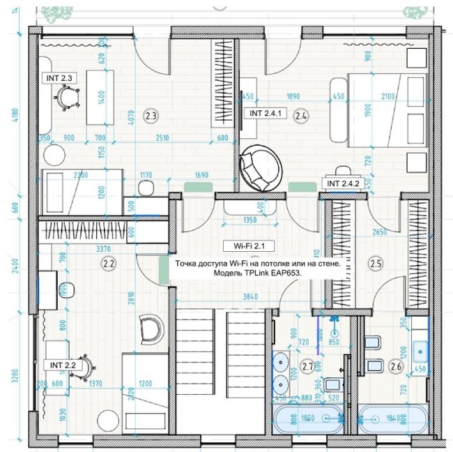 Здесь обозначены маркировки кабелей к интернет-розеткам и зона для размещения точки доступа Wi-Fi.