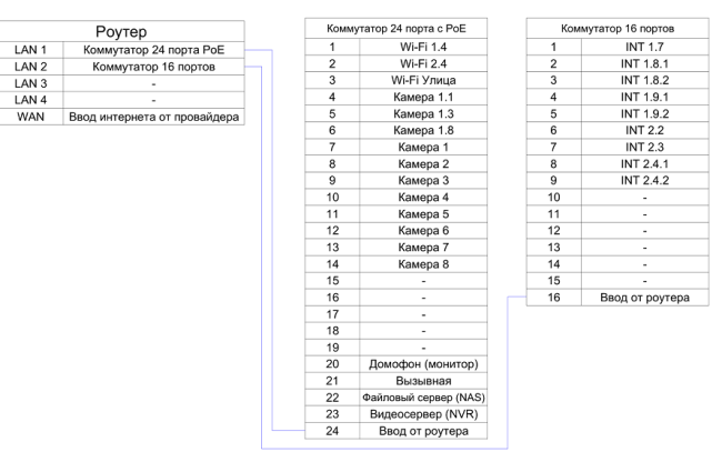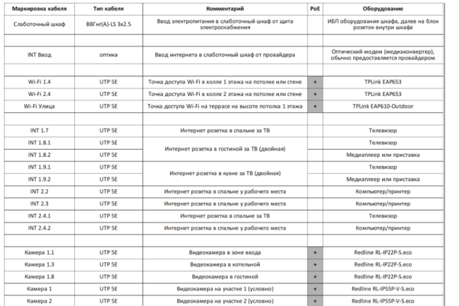 Это таблица всех кабелей, приходящих в слаботочный шкаф, с указанием того, что к ним подключается, маркировки кабеля, типа кабеля.