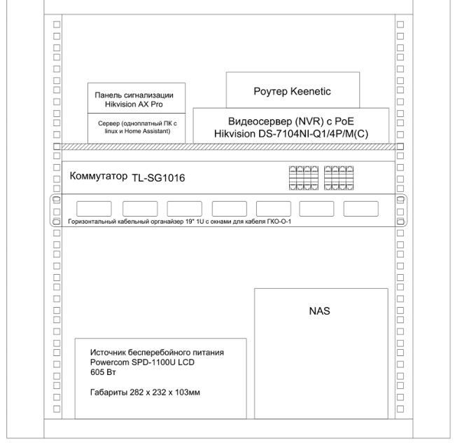 По этой схеме можно понять, какого размера нужен шкаф, сколько там будет свободного места, как расположить оборудование.