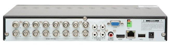 На картинке вид сзади регистратора Redline RL-MHD16n. Мы видим 16 входов для проводных камер любого формата (такой разъём называется BNC), 4 входа для аналоговых микрофонов, выходы на мониторы VGA и HDMI, выход на колонки, USB для мышки или флешки (для обновления прошивки или выгрузки видеоролика, постоянная запись на флешку или внешний жесткий диск невозможна), разъём подключения к компьютерной сети.