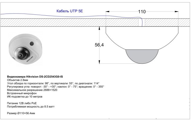 Важно, кстати, заранее продумать в зависимости от камеры, как будет подводиться кабель. Вот схема установки камеры в проекте, здесь кабель выводится из подвесного потолка через отверстие и сразу удобно входит в камеру.