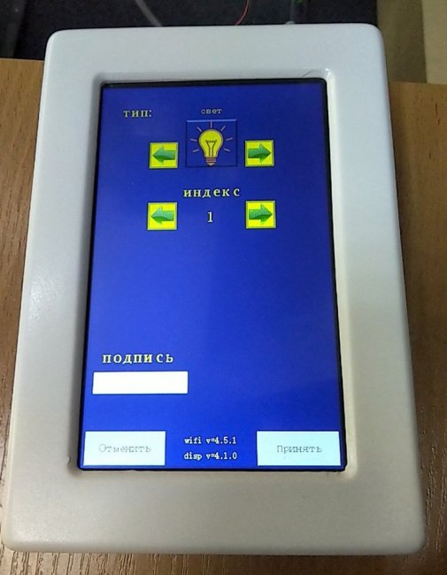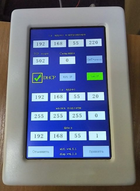 Панелька может быть подключена к сети как кабелем, так и по Wi-Fi. Настраивается имя сети Wi-Fi, пароль, частота опроса контроллера (по умолчанию 300мс).