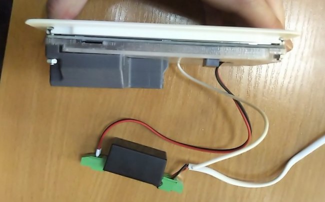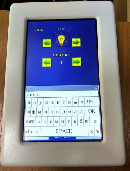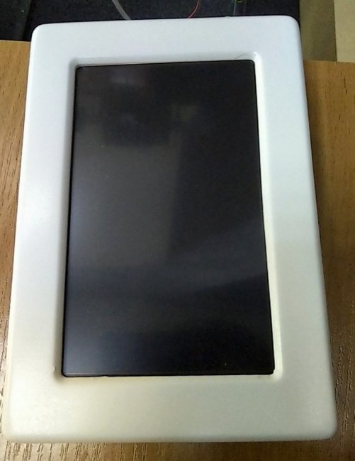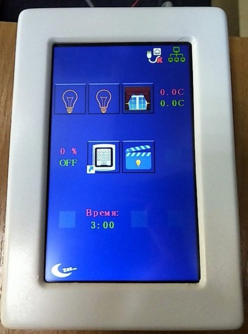 В системах Умный Дом есть некая проблема с настенными сенсорными панельками небольшой диагонали — их не найти. В качестве устройств управления используются либо обычные клавишные выключатели, либо приложение на смартфоне или планшете, либо оно же, установленное на iPad, стационарно установленный на стене. iPad в настенной рамке iPort или Basalte будет выглядеть солидно и позволит управлять всеми системами умного дома, но его стоимость далеко не бюджетная. Достаточно сказать, что настенное крепление стоит дороже самого планшета. Сенсорные панельки небольших диагоналей есть, например, у Zennio. Но они стандарта KNX, что означает, что сама система должна быть KNX, а панель стоит от 400 евро. Хотя, они очень симпатичные, просто не для бюджетных решений. Компания HomeLogicSoft, производитель программного обеспечения EasyHome и контроллера EasyHomePLC, выпустила интересные панельки EasyHomeTPD диагональю от 2.4 до 7 дюймов. Рассмотрим панель диагональю 5 дюймов, она кажется самой востребованной из всех. Меньше 5 дюймов, как будто, маловато, а больше — уже почти планшет на стене. Стоимость панели диагональю 5 дюймов на весну 2020 года составляет 15 500 рублей. В отличие от планшета на Android (который мог бы стоить немного дешевле такой панели) у EasyHomeTPD есть такие преимущества: Встраиваемое исполнение, не требует придумывать отдельного крепления или рамки. Панель не на Android, так что приложение вдруг само не закроется, не свернётся и не зависнет. Подключение к компьютерной сети возможно как через Wi-Fi, так и по проводу, что даёт больше надёжности. Панелька может включаться при нажатии в любое место на экране и легко гаснуть Панелька доступна с двумя вариантами рамки, из металла и из пластика. Вот картинка с сайта производителя в металлической рамке: Вот панель в пластиковой рамке. Она у меня вживую, так что фотографий будет много. Внешние размеры рамки 102х174мм. Полная глубина 37мм. Устанавливается в собственную монтажную коробку, которую нужно заранее установить в бетон или гипрок. Вот так выглядит установленная в бетон монтажная коробка для панели с выведенными в неё кабелями: К панели подводятся кабель UTP от коммутатора и 220 вольт кабелем МКШ 2х0.75. В монтажной коробке вверху и внизу видны крепления для уголков с магнитами для крепления панельки. Уголки фиксируются винтом. Они могут двигаться в коробке и регулировать глубину установки экрана. Питается панель от 24 вольт постоянного тока, 300мА. Нужно либо поставить блок питания в щите и вести до панели сразу 24 вольта, либо разместить в монтажной коробке за панелью маленький блок питания 24 вольта. Вот такой: Поддержки питания через PoE, к сожалению, нет. Вот панелька в профиль с подключенным блоком питания. Вся задняя часть из пластика. Все элементы сенсорной панели, включая рамку, отпечатаны на 3D принтере. Панелька сзади: На фото не видно, но в центре панели сзади находится полноценный разъём ethernet с индикаторными светодиодами. Чуть выше разъёма питания и симметрично с другой стороны видно под пластиком крепёжные магниты. У панельки резистивный сенсорный экран, далеко не такой приятный, как у iPad или почти любого другого планшета. Разрешение 480х800 точек. Самое интересное — интерфейс панели. Запускается она примерно 10 секунд. Вот пример интерфейса: На экране 12 элементов. Это могут быть иконки включения и выключения чего-либо, термостат, управление