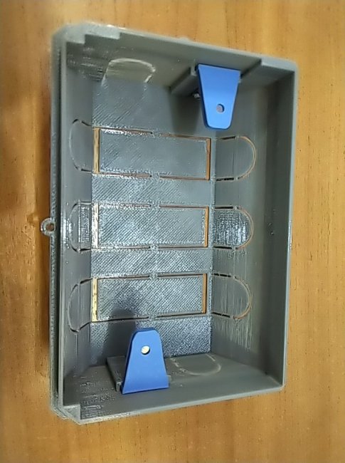 К панели подводятся кабель UTP от коммутатора и 220 вольт кабелем МКШ 2х0.75. В монтажной коробке вверху и внизу видны крепления для уголков с магнитами для крепления панельки.