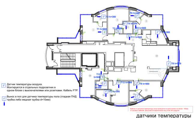 Тут и условные обозначения, и более подробные комментарии, и размерные привязки датчиков. Номера датчиков соответствуют номерам помещений.