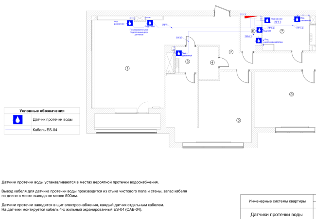 В большинстве случаев по моему проекту работают люди, никогда не имевшие опыта работы ни с какими датчиками или приводами системы Умный Дом, а зачастую и со слаботочными системами тоже. Поэтому пояснений должно быть очень много, чем больше, тем лучше. Вот фрагмент более позднего проекта со схемой монтажа кабелей для датчиков протечки воды: