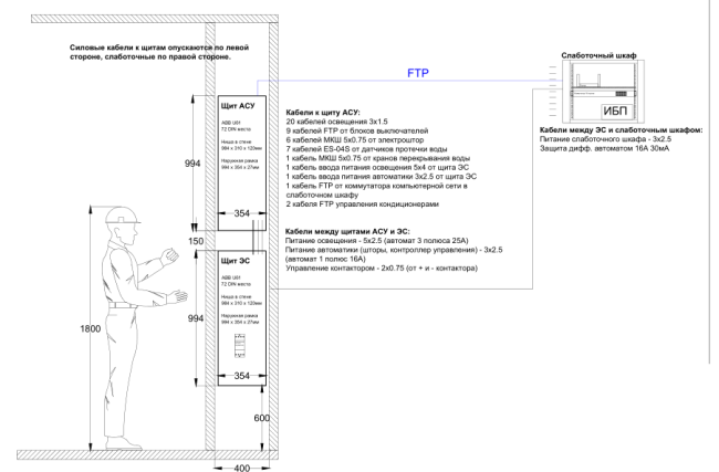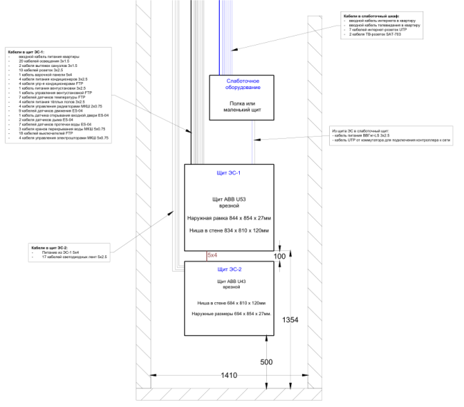 В какой-то момент (примерно в начале 2019 года) в проекте стала обязательно появляться схема установки щита и заведения в него кабелей. Вот такая: