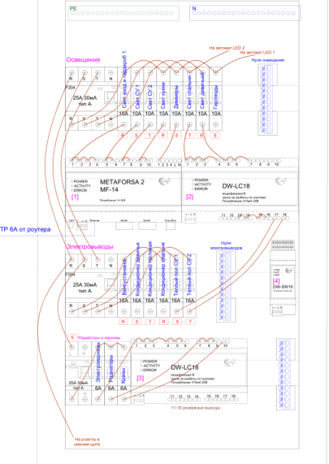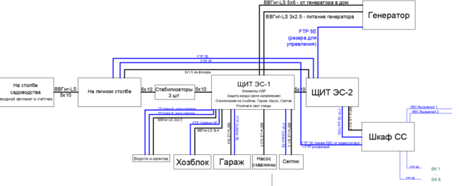 С середины 2019 года на схеме электрощита стал обозначать слаботочные подключения, то есть, питание элементов на 12 и 24 вольта. Это действительно важно и неочевидно, следовало всегда эти подключения прорисовывать подробно. Но оказалось также, что и силовые кабели нужно подробно обозначить. Получается вот такая подробная схема: