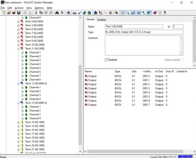 Подробно описывать процесс не буду, в инструкции всё есть. Суть в том, что TwinCAT подключается к контроллеру по его IP адресу (компьютер и контроллер должны находиться в одной локальной сети), потом мы сканируем подключенные к контроллеру модули и видим их полный список. Вот контроллер (BC9050) и 20 подключенных к нему модулей, включая оконечный KL9010. Модуль KL4408 отображается как два терминала по 4 выхода.