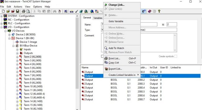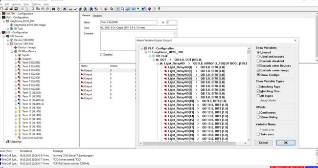 Утвердимся с терминами. Beckhoff — немецкая компания, выпускающая промышленную автоматику. Бренд мирового уровня (компания основана в 1980 году), не на слуху у большинства людей потому, что под ним не выпускаются бытовые приборы, как у Siemens или ABB. Контроллеры и модули ввода-вывода Beckhoff могут свободно программироваться и отлично используются в создании домашней автоматики и систем Умный Дом. EasyHome — программное обеспечение, разрабатываемое компанией Homelogicsoft в Санкт-Петербурге с 2008 года. Состоит из прошивки для контроллера (главным образом, Beckhoff) и пользовательского приложения, устанавливаемого на iOS, Android или Windows и позволяющего удобно управлять системой. Включает не только возможность управления и контроля, но и настройку алгоритмов работы систем. Для настройки не требуется сложное программирование, всё делается через удобный интерфейс приложения. Программное обеспечение платное, лицензия стоит 85 тысяч рублей для установки на контроллер Beckhoff. EasyHomePLC — контроллер, выпущенный компанией Homelogicsoft в 2017 году. Позволяет создавать простую и функциональную систему автоматики для дома, квартиры или каких-либо техпроцессов. В нём уже вшита лицензия на EasyHome, поэтому он крайне выгоден по стоимости по сравнению с аналогичными решениями и прост в установке и настройке. Что самое первое, что нужно настроить после монтажа контроллера? Назначение входов и выходов. То есть, нам надо прописать в контроллере, к какому входу и какому выходу что подключено. Это относится, кстати, вообще к любой системе Умного Дома, включая не только центральные контроллеры, но и системы типа Z-Wave и KNX. В EasyHome (как и во всех других системах) есть фиксированные значения типов дискретных и аналоговых входов и выходов, нам нужно по каждому входу и выходу задать тип элемента и номер, под которым этот элемент будет присутствовать в программе EasyHome. Основное отличие между настройкой системы на контроллере Beckhoff и системы на контроллере EasyHomePLC состоит в том, что рейку модулей Beckhoff сначала нужно настроить через собственную утилиту TwinCAT, и только потом через EasyHome. Для настройки EasyHomePLC никакая программа кроме EasyHome не нужна, что крайне удобно. Прямо в приложении, хоть с iPad, хоть с компьютера. Назначение дискретных входов в EasyHomePLC Для настройки Beckhoff нам нужно установить приложение TwinCAT на компьютер с Windows. Ссылка на него и подробная инструкция есть здесь: У Beckhoff есть контроллеры, настраиваемые через TwinCAT 2 и через TwinCAT 3. С EasyHome работают исключительно настраиваемые через TwinCAT 2. Версия TwinCAT написана в описании контроллера. Идеальным вариантом считается CX8080, так как в него уже встроены порты RS232 и RS485 при невысокой стоимости контроллера. Подробно описывать процесс не буду, в инструкции всё есть. Суть в том, что TwinCAT подключается к контроллеру по его IP адресу (компьютер и контроллер должны находиться в одной локальной сети), потом мы сканируем подключенные к контроллеру модули и видим их полный список. Вот контроллер (BC9050) и 20 подключенных к нему модулей, включая оконечный KL9010. Модуль KL4408 отображается как два терминала по 4 выхода. Модули рейки Beckhoff в TwinCAT Выбирая модуль мы видим его каналы (входы или выходы) и описание модуля. Например, KL2408 — 8 каналов выхода по 0.5 ампера. Описание модуля KL2408 Нажимаем правой кнопкой мыши по нужному каналу и выбираем Change Link, что означает изменение привязанной переменной 