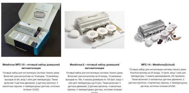 Готовый набор Metaforsa включает контроллер на 24 входа, 10 релейных выходов по 16А, вход 1-wire для датчиков температуры, 4 канала диммирования, 3 компактных датчика движения, 2 датчика протечки, 4 магнитных геркона, 4 температурных датчика, источник питания 24 вольта. Если посчитать комплект на 3-комнатную квартиру на контроллере Метафорса (прибавив к готовому контроллера несколько датчиков и исполнители), то получим стоимость оборудования в районе 260 тысяч рублей. Для квартиры поменьше (1-2 комнаты) уложимся в 190 тысячи рублей. Это если не добавлять домофон, аудиосистему и датчики СО2.