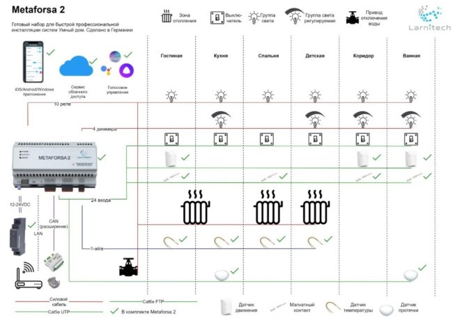 Система может отлично работать в большом здании, например, многоквартирном доме или отеле. А может быть установлена в частном доме или квартире. Есть специальный комплект для небольших систем — Metaforsa, с ним стоимость системы хоть и превысит стоимость аналогичной системы на EasyHomePLC или Wirenboard, но будет гораздо проще в установке и настройке.