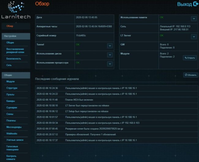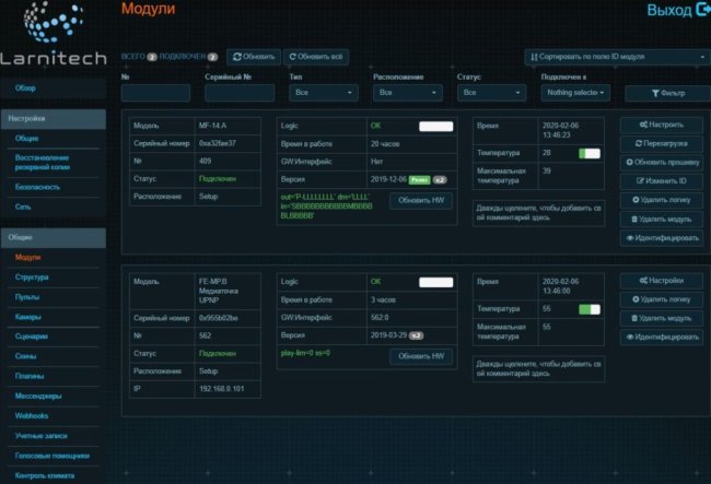 Обновление прошивки контроллера и модулей максимально простое. Система сообщает о наличии новых версий прошивок и программного обеспечения. Выбираем версию и нажимаем «Обновить», обновление длится не более 30 секунд.