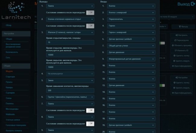 Примечательно, что настройка не требует ручного добавления модулей в систему, они появляются автоматически после подключения их на шину, остаётся только настроить назначение, название и поведение элементов.