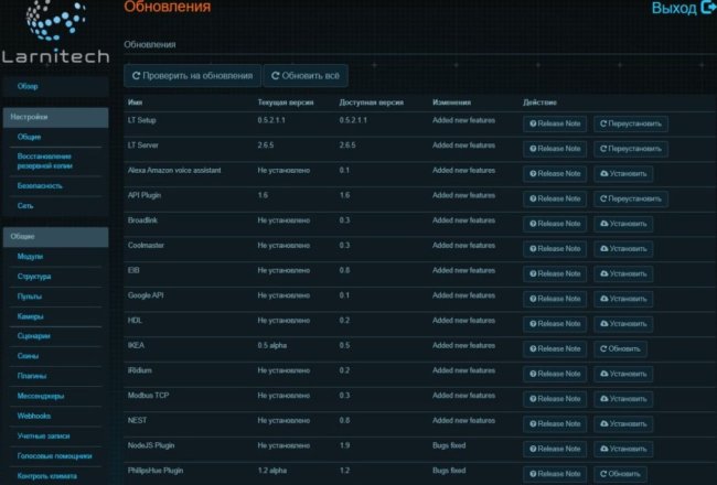 Плагины — это дополнительные элементы системы, которые добавляют в неё интеграции с разными сторонними системами. Они скачиваются в web интерфейсе, причём, можно выбирать версию плагина, можно обновлять отдельно от остальной системы. Как в Fibaro Home Center.