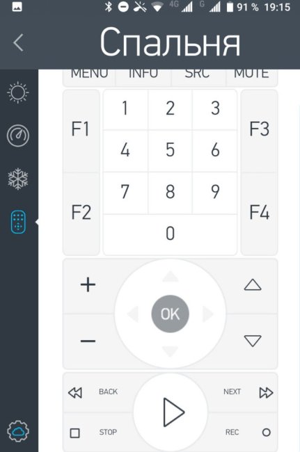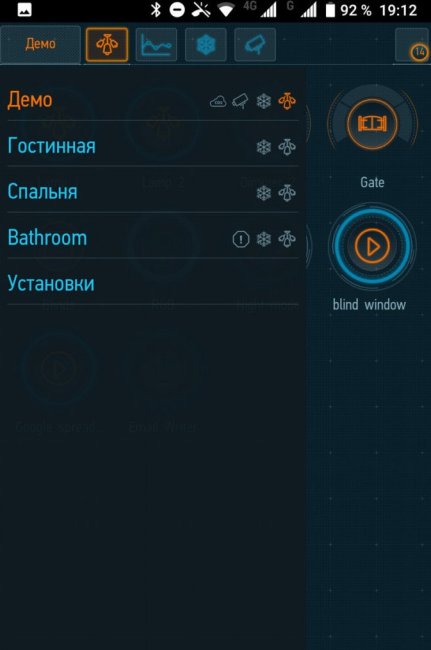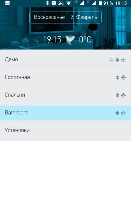 Вот ДЕМО интерфейс приложения. В верхней строке кнопка выбора комнаты и переключение системы. Справа — кнопка настроек и уведомлений.